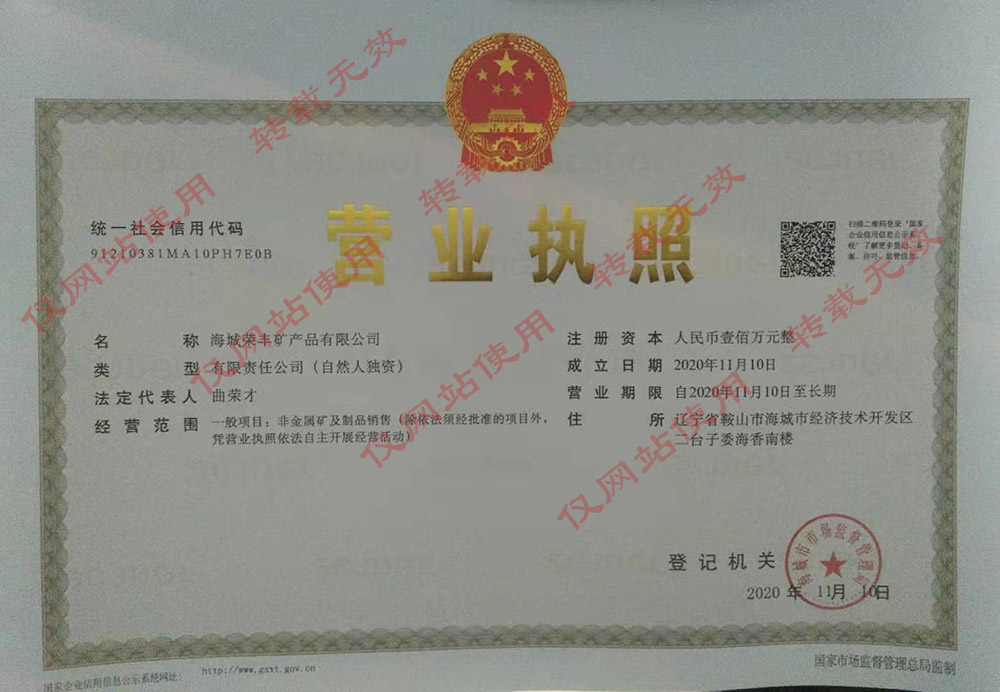 版权所有:海城荣丰矿产品有限公司 咨询电话:13604120688  地址:辽宁省海城市铁西开发区黄河路52号  辽ICP备16002086号-1